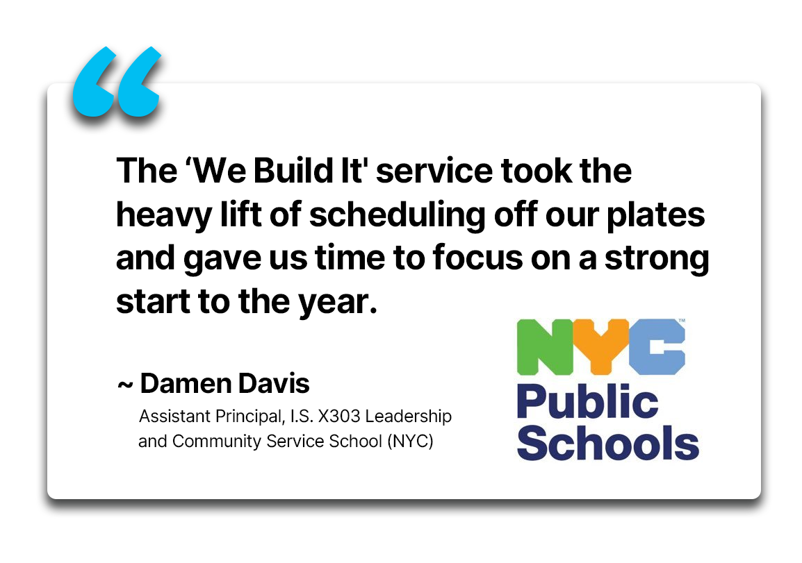 Our scheduling experts are here to support you every step of the way, offering strategies grounded in best practices and hands-on guidance whenever you need it. With clear insights into how scheduling impacts instructional time and student outcomes, you can make informed, strategic decisions that align your schedule to your school’s goals and grow as a school leader.